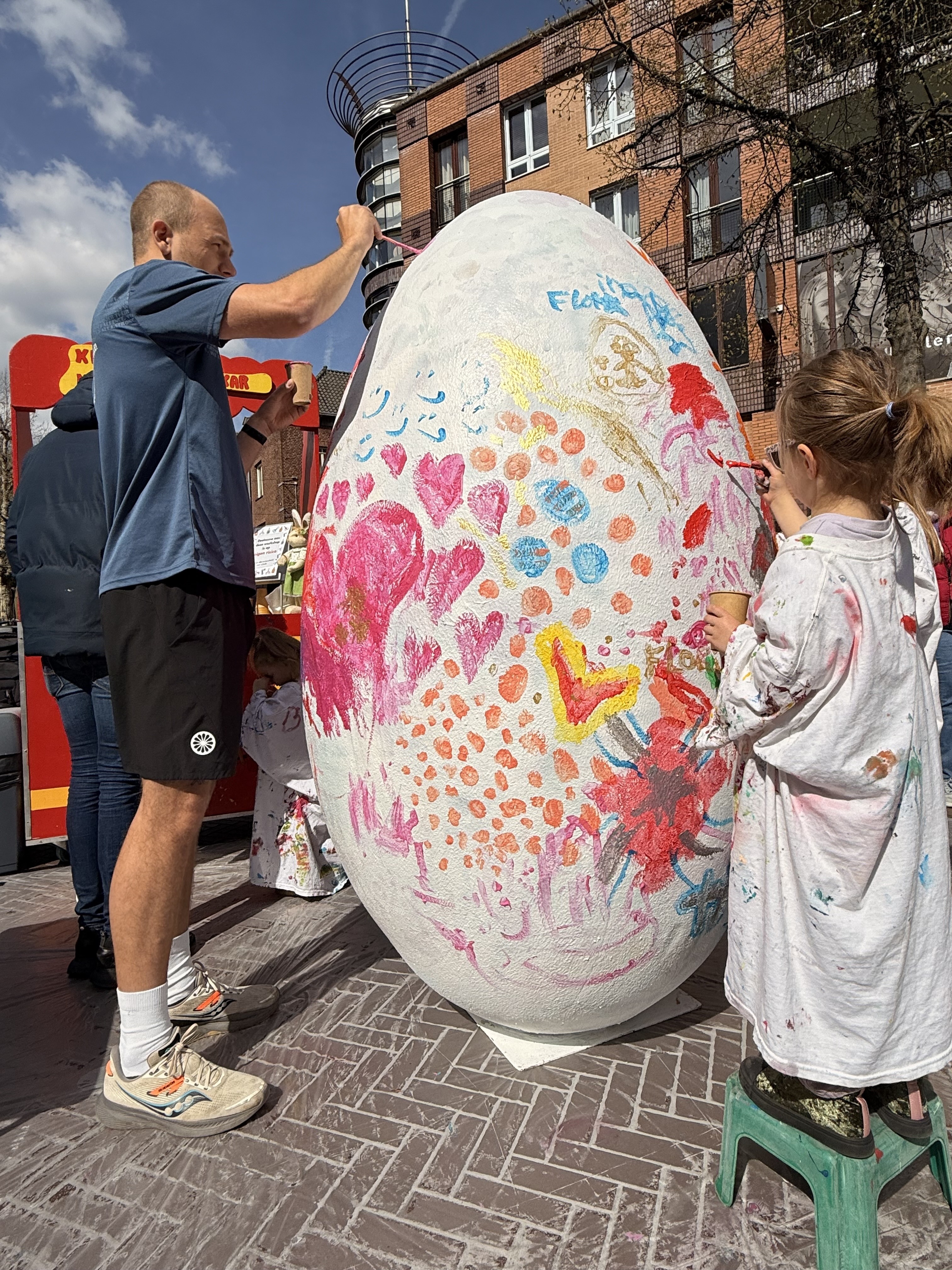 Tegelijkertijd laten we kinderen hun mooiste creaties verven op een levensgroot paasei. Het paasei groeit uit tot een echte blikvanger in de straat met een hoop blije gezichten als resultaat.